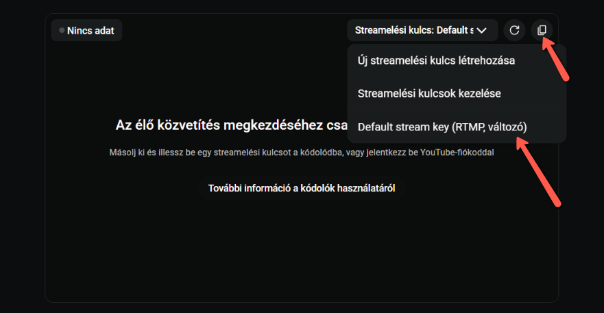 Ebben a kis ablakban a Streamelési kulcs: Default, stream key (RTMP, változó) érték volt kiválasztva.