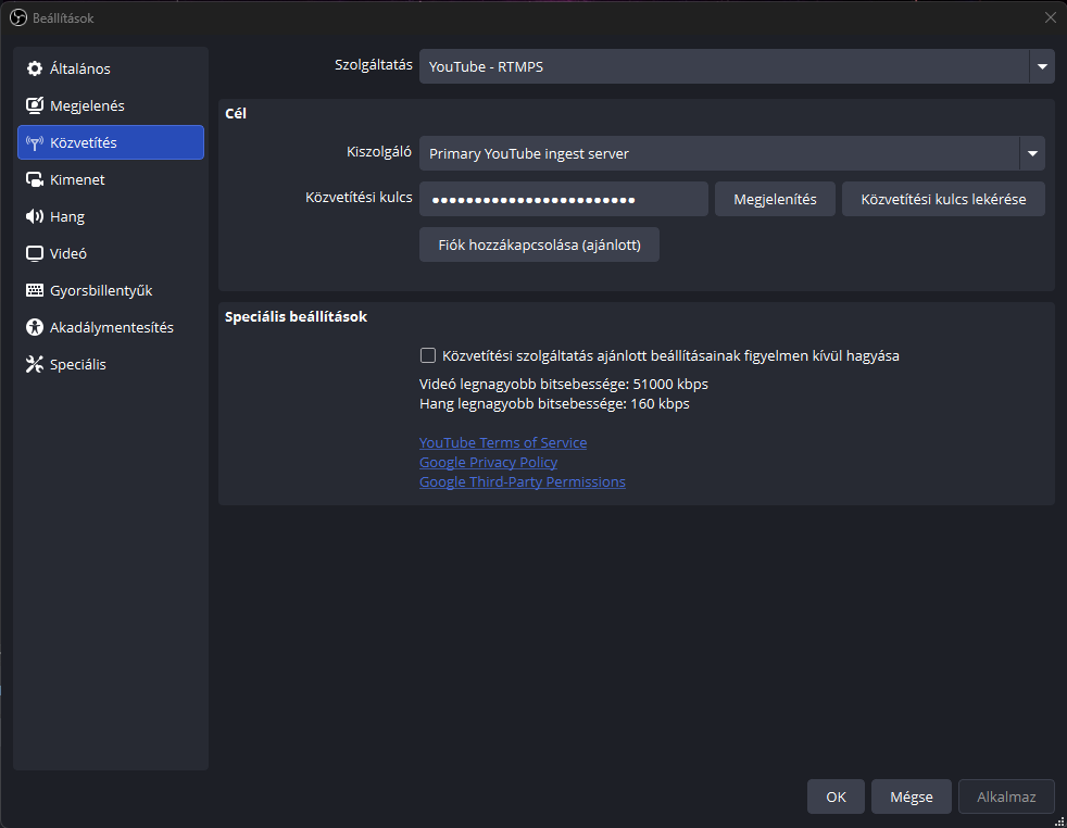 Nyisd meg az OBS-t: Beállítások -> Közvetítés -> Szolgáltatás: lenyílóból válaszd ki a YouTube – RTMPS opciót.
